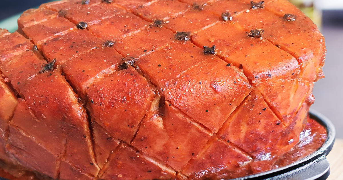 Coloca el jamón en un refractario, báñalo con la mezcla.